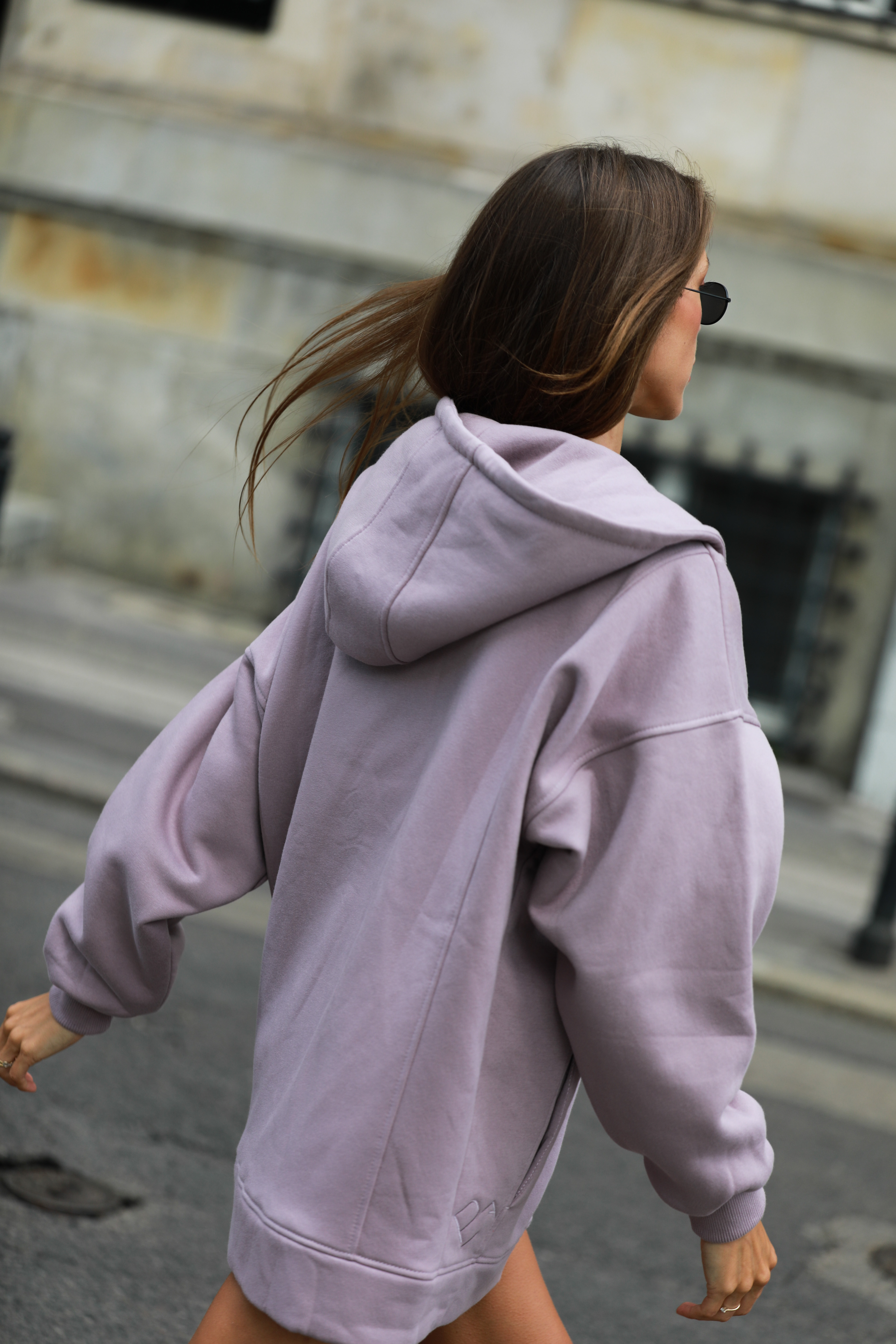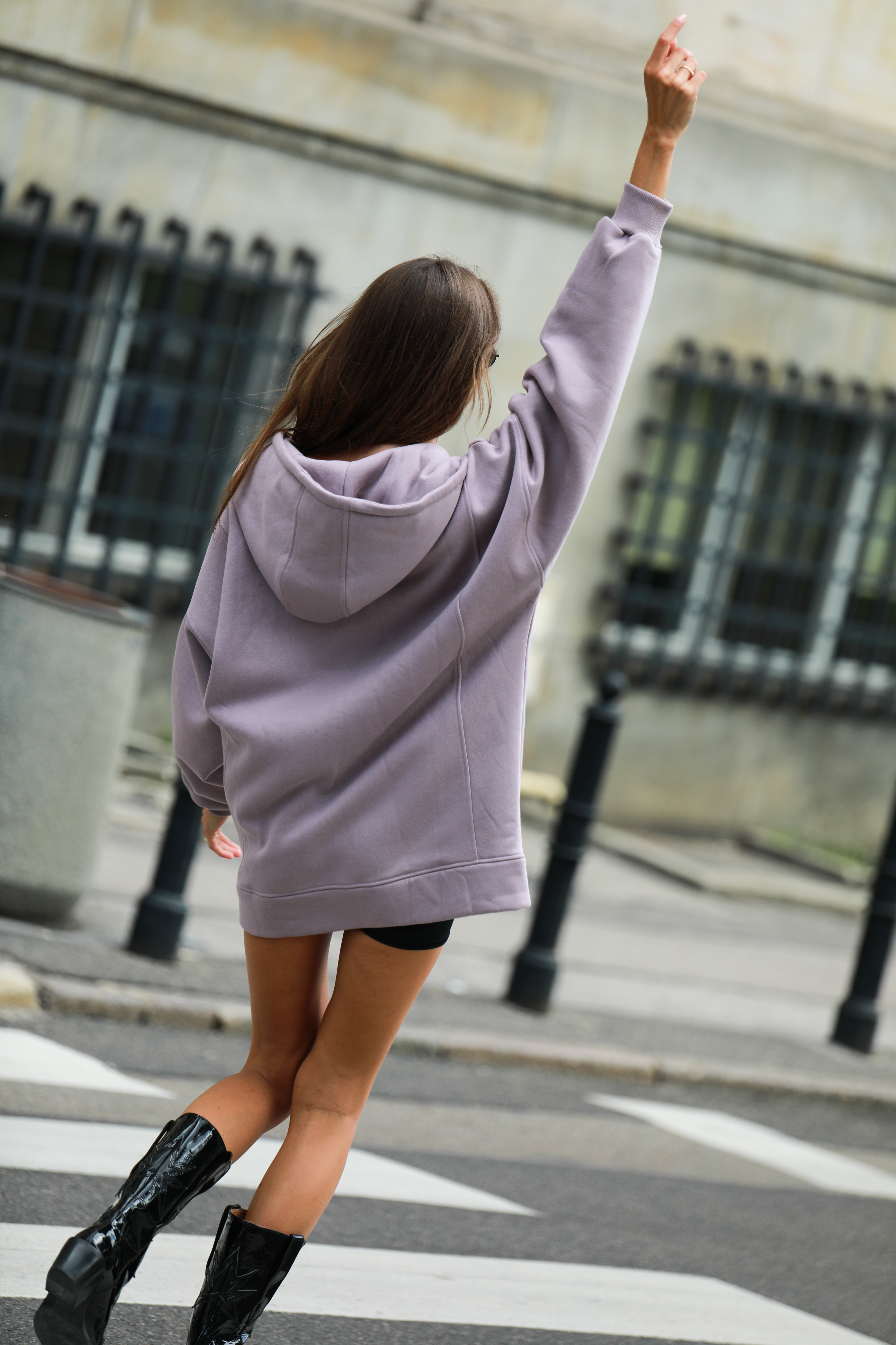 Damska oversizowa bluza z kapturem w limitowanym fioletowym kolorze.