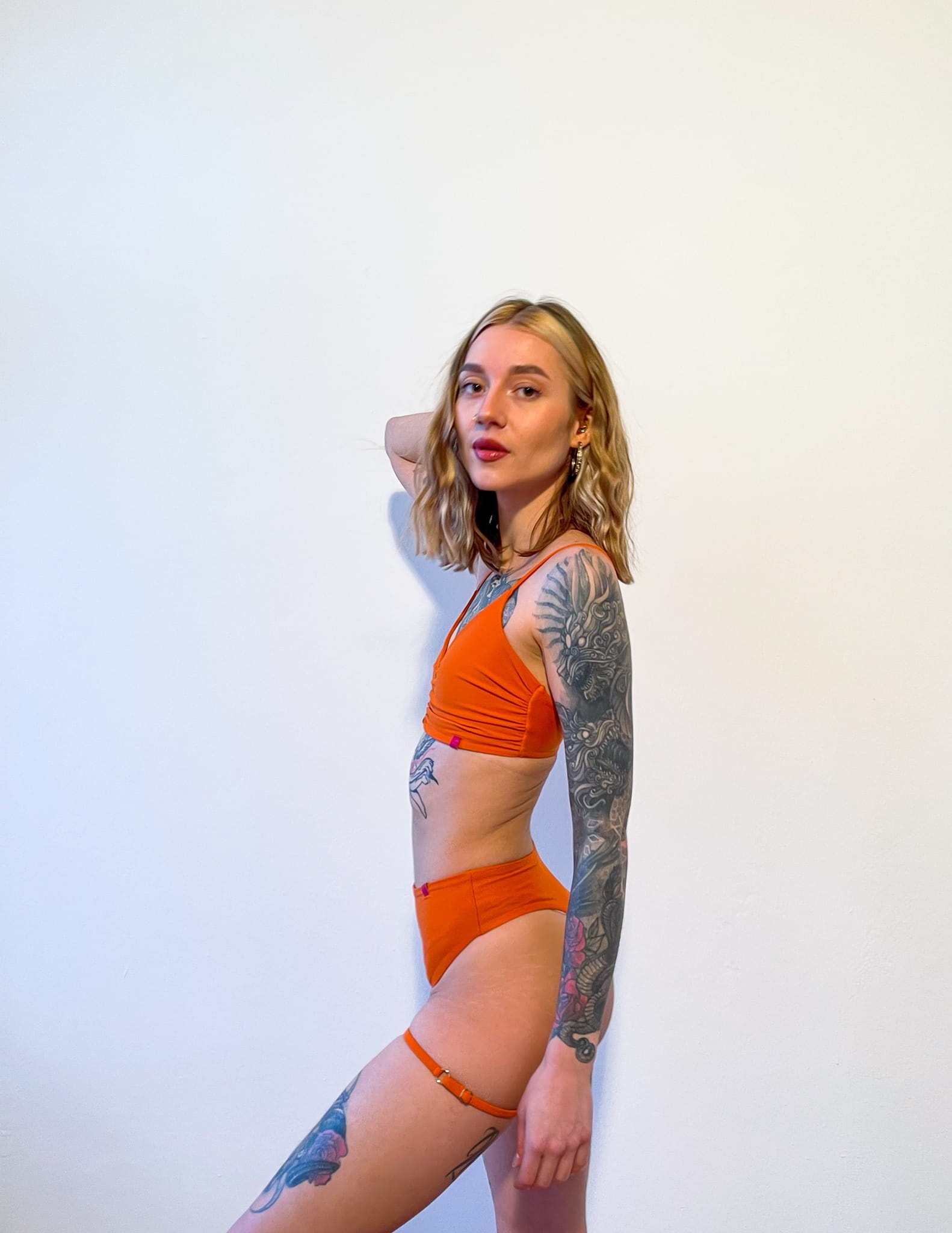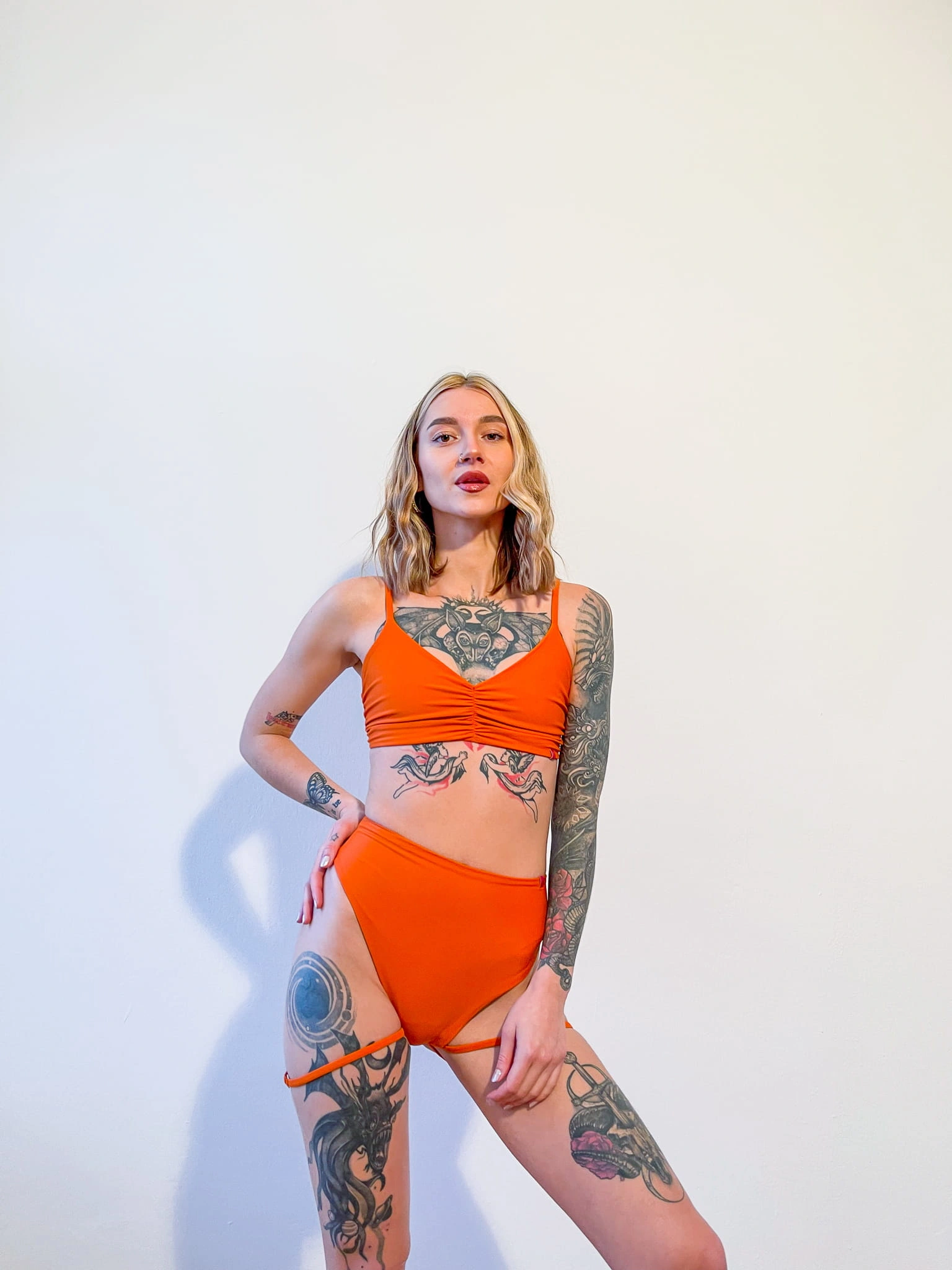 Orange Bliss Strap high-waisted pole dancing shorts with adjustable straps.