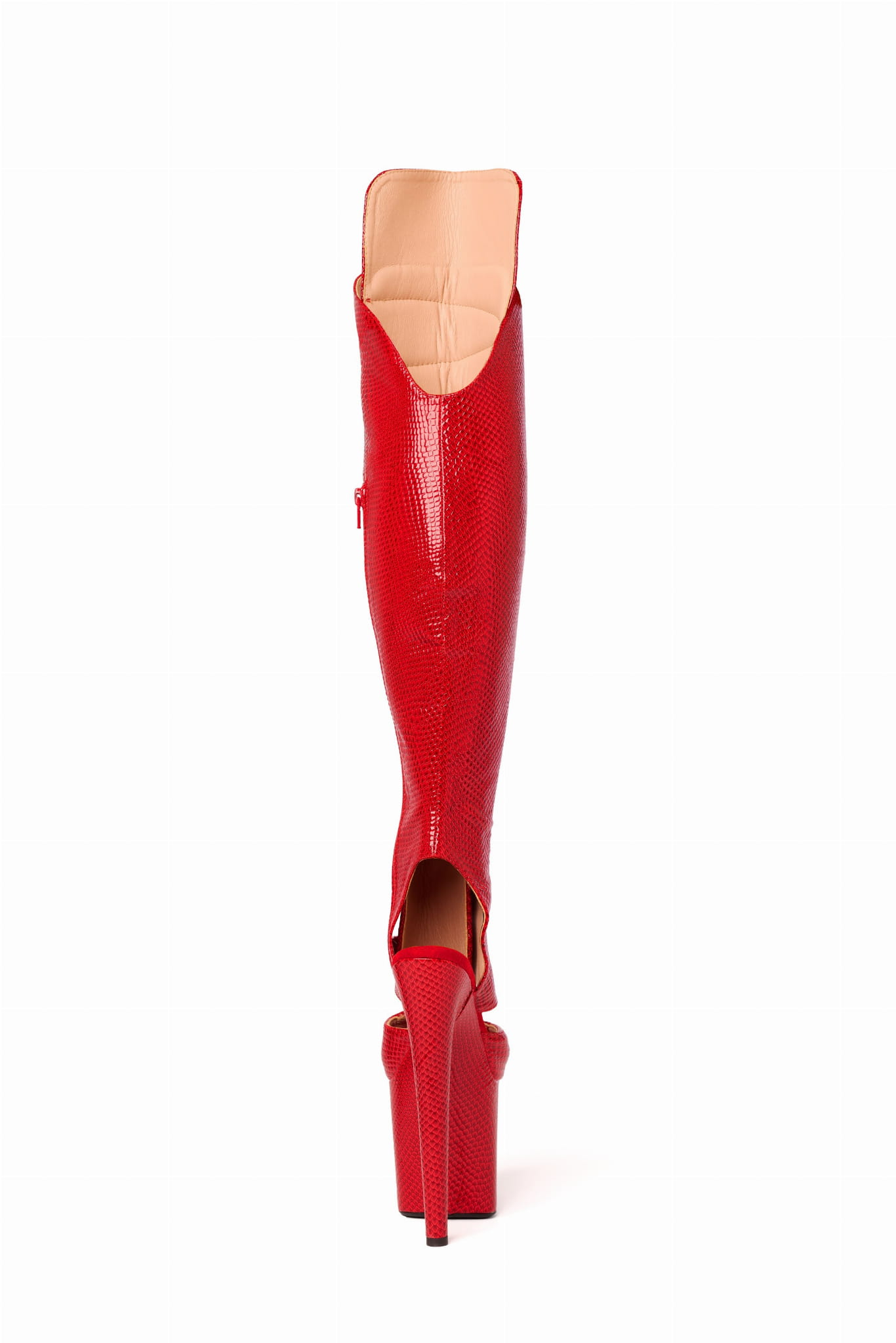 Miss Fate's snakeskin pole dancing boots are the perfect choice for dancers who love to turn heads. Bold lines and elegant finishes make these exotic pole dancing shoes a real eye-catcher.